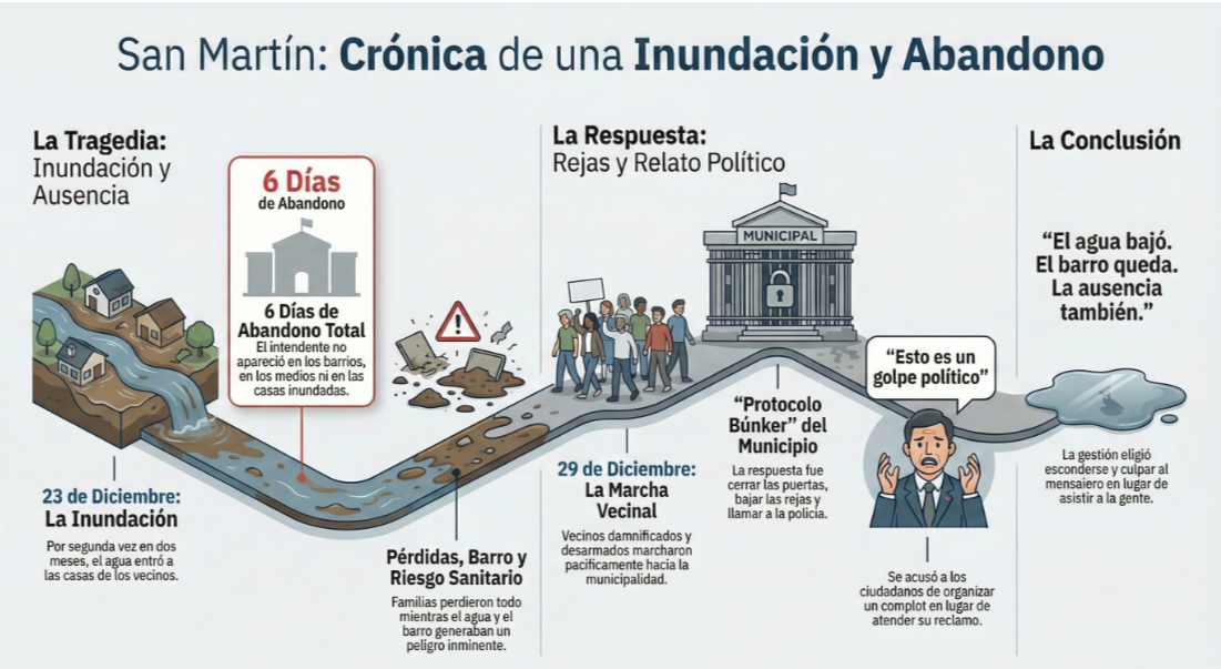 En octubre, San Martín ya había sufrido inundaciones. Todavía había heridas abiertas cuando el 23 de diciembre el agua volvió a entrar, como si nadie hubiera aprendido nada. Dos inundaciones en menos de dos meses no son mala suerte: son desidia sostenida.